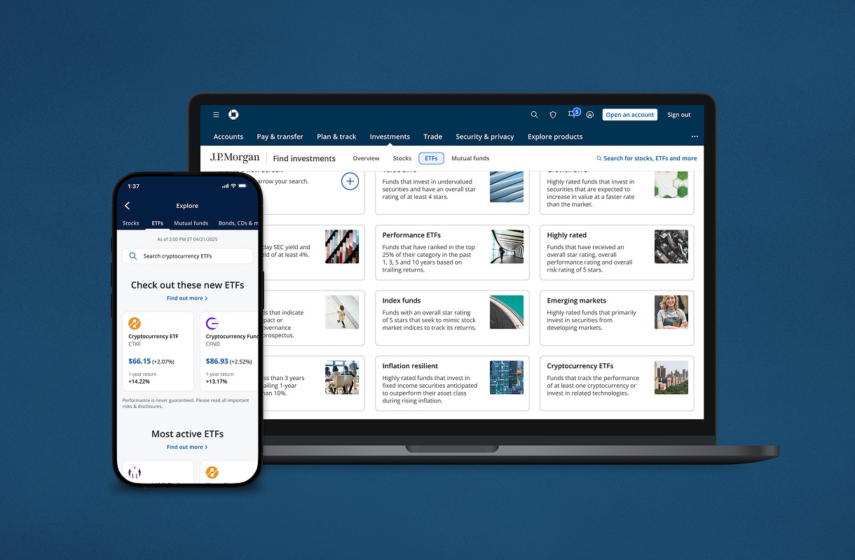 J.P. Morgan Self-Directed Investing allows you to discover and invest in ETFs that track the performance of cryptocurrencies, such as Bitcoin, Ethereum and more, or invest in related technologies – all in the Chase Mobile® app and chase.com.