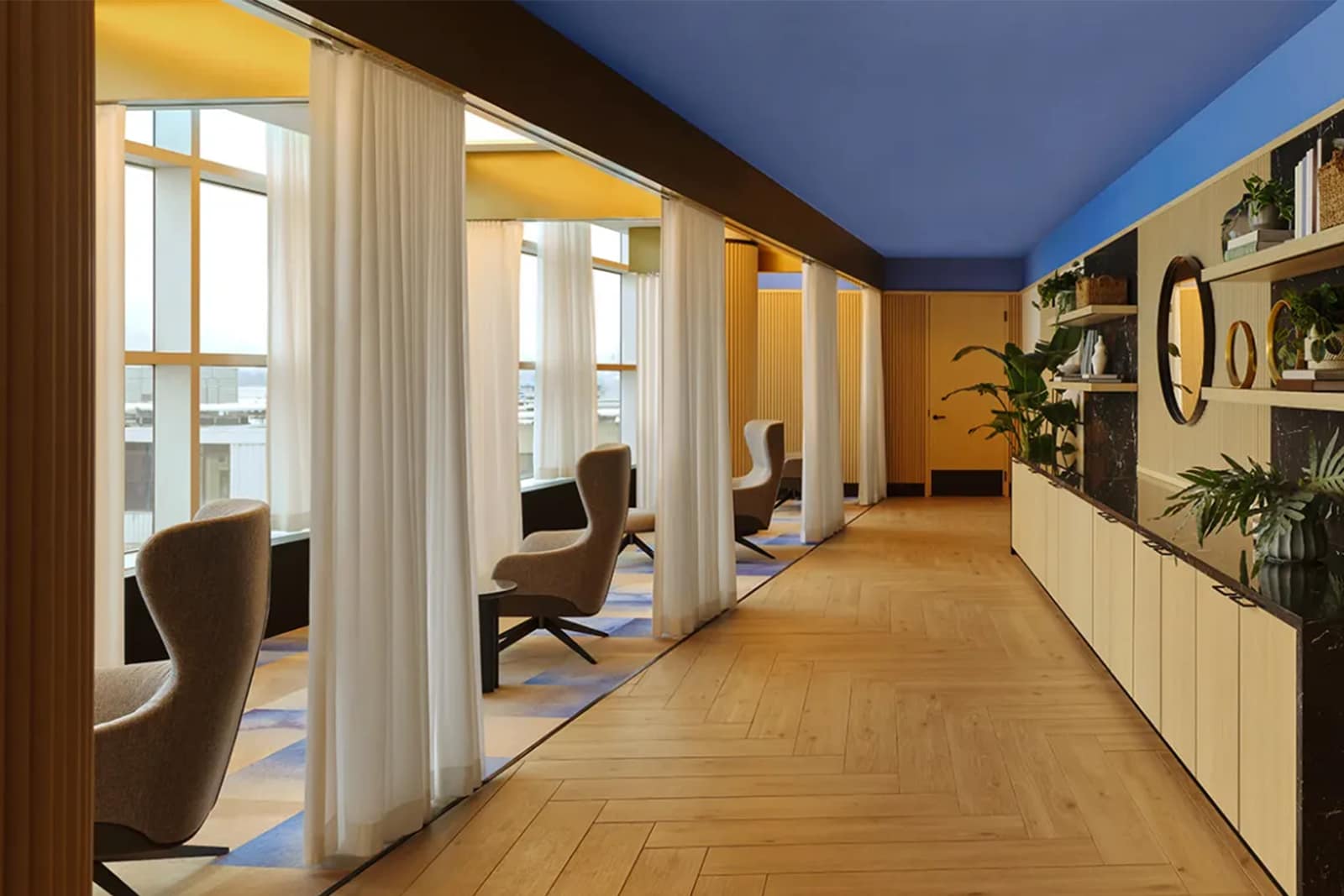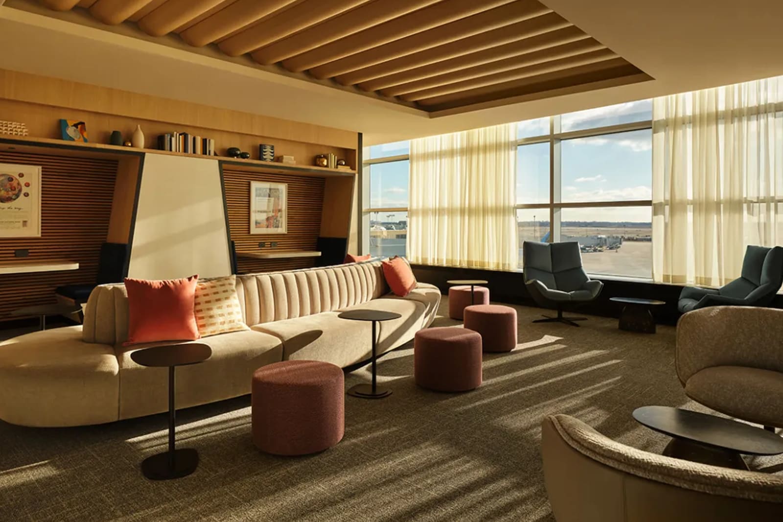 - Areas for working or relaxing, including private phone rooms