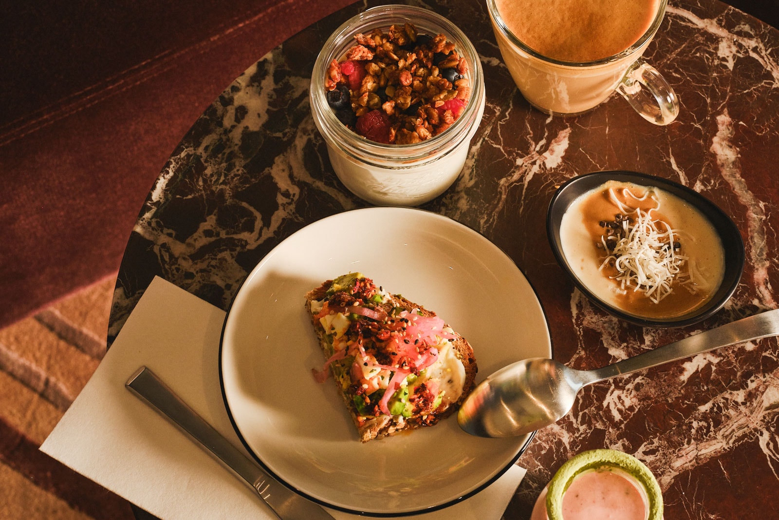 For breakfast, order a Momofuku Chili Crunch-topped avocado toast or Miso maple yogurt parfait served alongside a strawberry coconut matcha smoothie.