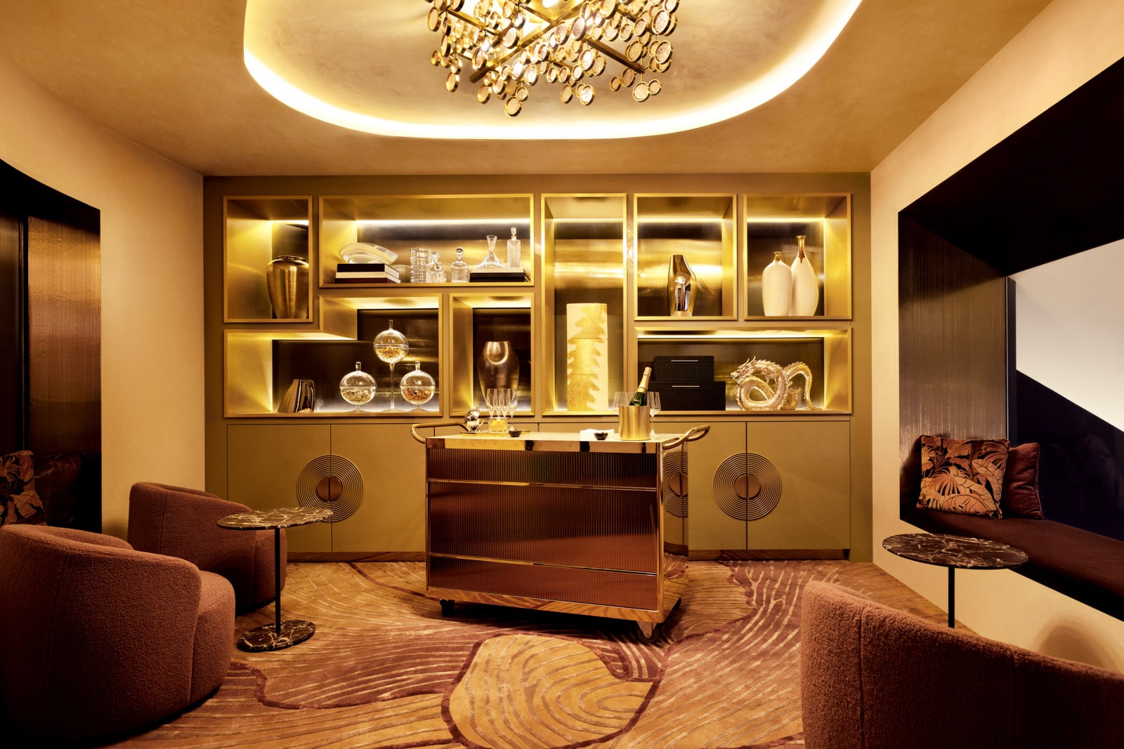 On the lounge’s second floor, you’ll find the champagne parlor, a plush Vegas-inspired space that serves sparkling wine from a shimmering gold bar cart. The luxe space features a custom chandelier, velvet banquet cushions and snacks like parmesan crisps, dried kiwi slices and champagne gummy bears, in addition to a selection of passed bites from Momofuku.