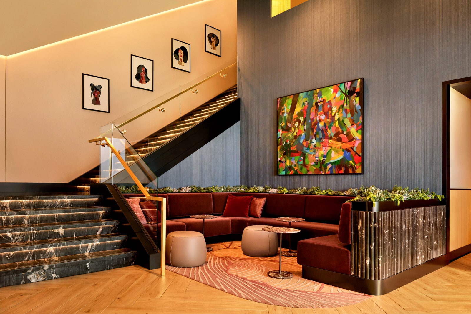 On the second floor, you’ll find the champagne parlor, where you can toast your trip while sitting in a plush window seat overlooking the lounge below. There’s also the cozy, velvet-lined nook beside the marble staircase, a dining area next to the servery and a productivity area complete with plush blue chaises and a vapor fireplace lined with sapphire-blue tiles. The entire lounge is adorned with an assortment of colorful paintings, drawings and photographs curated by the JPMorgan Chase Art Collection.