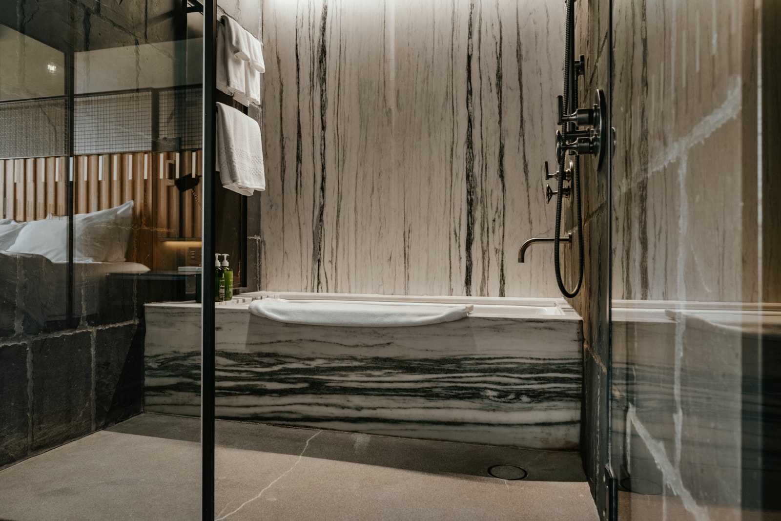 Upcycled industrial materials (blackened steel, barn wood) star in all the hotel’s guest rooms and suites, and minimal artwork allows the city views to really steal the show through the floor-to-ceiling windows. Even the entry-level rooms have sitting areas and open, marble and mahogany bathrooms with rainfall showers. Upgrade to a higher room category for views of the Manhattan skyline or the Brooklyn Bridge, or move up to a suite for additional space with a pullout sofa and an oversize bathroom that might include a soaking tub. Fans of the 1 Hotel brand will find familiar amenities throughout, including filtered water taps for filling up your reusable water bottle and a yoga mat for impromptu sun salutations.