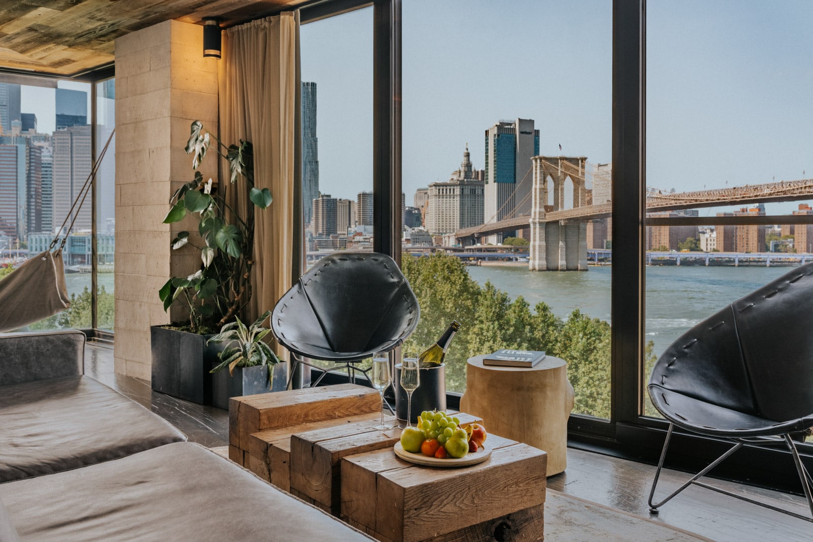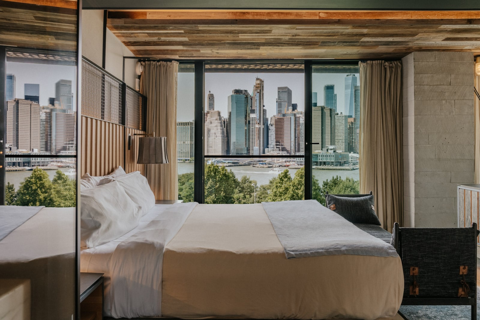 Set on a prime wedge of real estate in Brooklyn Bridge Park along the East River, the hotel is easily reached by public transportation. It’s close to the F train at York Street, or the A and C at High Street, and guests can even get here via the South Brooklyn route of the NYC Ferry. Manhattan is right across the Brooklyn Bridge, but guests staying here might not want to leave Brooklyn Heights, or the nearby Dumbo and Downtown Brooklyn neighborhoods.