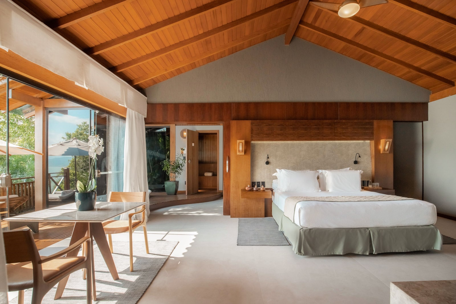 Slow living and minimalism are at the core of this low-key resort. Done up with clean-line furniture and natural textures, rooms are spacious and include bungalows with private terraces and one-bedroom suites with ocean-view pools. (That’s not to mention the serene central pool and private beach open to all guests.) There’s also an indoor-outdoor restaurant with a beachfront terrace—perfect for watching the sun set—and a spa with treatments inspired by local traditions, a glass-walled sauna and domed hammam. Don’t miss the complimentary breakfast, as well as activities like outdoor movie nights, beach parties and a hike to ancient spa ruins.
