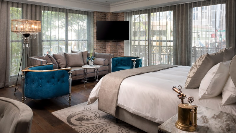 Transport yourself from central Charlotte to South America with a stay at Grand Bohemian. The hotel’s Argentinean influence is present everywhere from the lobby to the rooms, which are decorated with patterned tapestries, wooden furniture and pops of emerald and fuchsia. On the 16th floor, the adults-only Búho Bar serves tapas and cocktails alongside panoramic views of the Charlotte skyline. After a long day on the town, head to the Poseidon Spa, which features a private outdoor terrace for relaxing after your treatment.