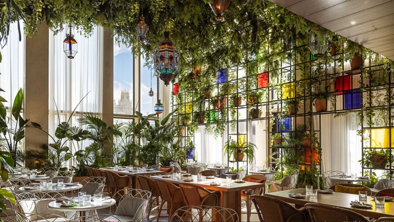 Occupying a 1924 neoclassical building just off Gran Vía, this 93-room property is filled with art: There’s a towering mural referencing Madrid’s history that can be viewed from the glass elevator, and a rooftop pool whose floor features an enormous flower mosaic. Guest rooms take inspiration from classic Castilian design, with arched doorways, wicker benches and decorative mirror frames, plus colorful accents—cobalt, crimson, pistachio—drawn from the hues traditionally worn by bullfighters. La Braserí, on the ninth floor, sprawls across indoor and outdoor spaces, with a seasonal menu that feels like a tour of Spanish cooking styles: tortilla vaga with smoked sardines and Basque-style pepper sauce, Huelva red shrimp tartare, a calamari sandwich and more.