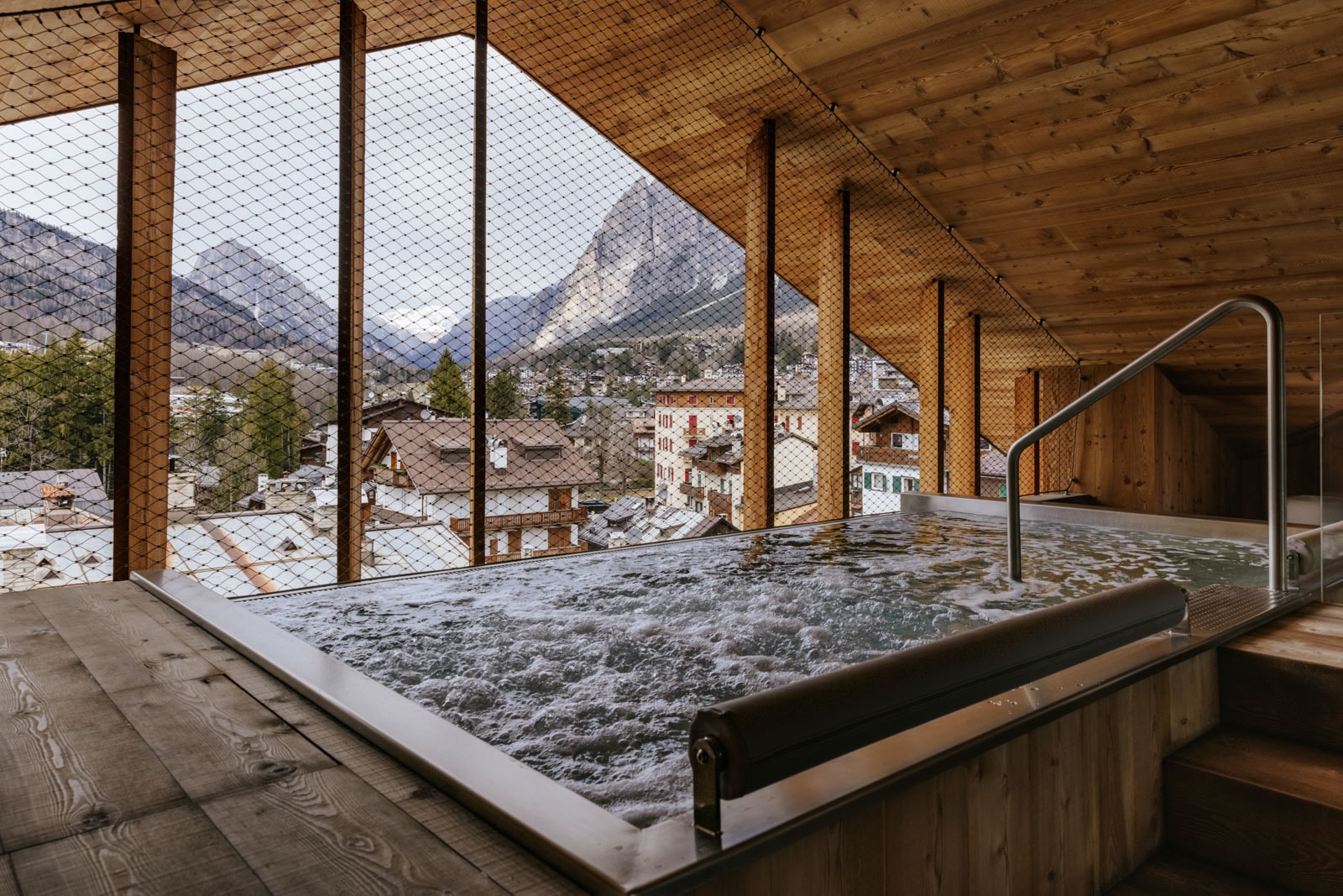 Modern luxury in historic buildings is de rigueur in the Dolomites, and Ancora Cortina is no exception. This member of the Leading Hotels of the World group is housed in an 1826 building on Cortina’s pedestrianized Corso Italia street and does that upscale-design-meets-period-details thing exceptionally well, thanks to a renovation spearheaded by its new global fashion mogul owner and a renowned designer. Furnishings and amenities were brought into the 21st century, while original ceiling paintings and decorative alpine motifs remain. The terrace here has been a hub for the city’s social life for some 200 years, so take a seat and order some fried zucchini flowers to go with the view.
