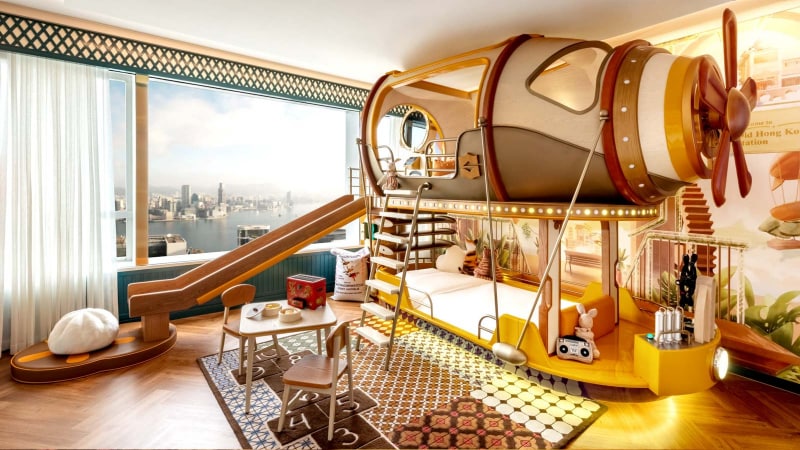 Enter the imposing grand lobby—all sleek marble and crystal chandeliers—and you might mistakenly think this 544-room luxury giant is for grown-ups only. But just head upstairs and you’ll find a series of fantastical family rooms, where kids can sleep in a classic Hong Kong tram, a camper van, a castle, a submarine and more—many are equipped with slides and thematically appropriate plushies. There’s a botanical-themed splash pad with water canons and spraying flowers, a game room and a pantry where parents can find any essentials they may have forgotten to pack, including wipe warmers, swim diapers, potties and bouncers.