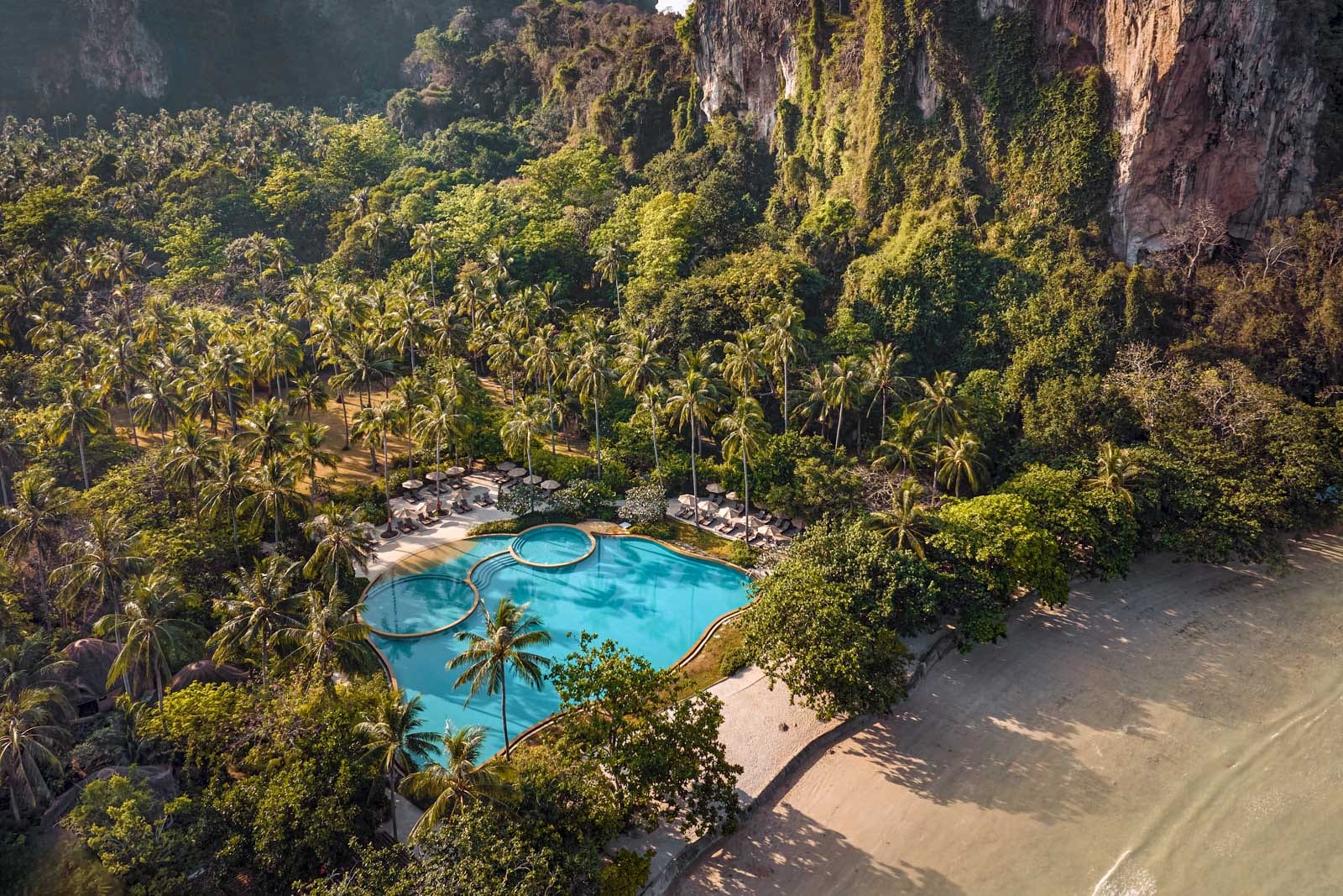 It’s almost impossible to outshine the natural splendor of Krabi’s towering karst formations, but Rayavadee comes close. Surrounded by limestone mountains and thick jungle, the property’s collection of two-story, toadstool-shaped villas and pavilions feels like a secret village—and the fact that the resort is only accessible by boat just enhances its hush-hush vibe. You’ll have three beaches to choose from (including the golden sands of Railay Beach), and you’ll want to plan at least one dinner at The Grotto restaurant, set in a limestone cave lit with lanterns, where you’ll dine on grilled seafood with your toes in the sand.