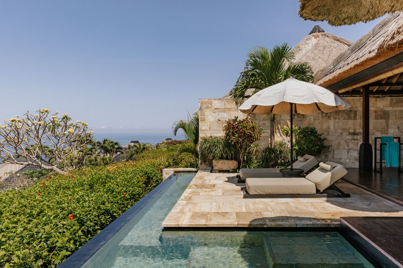 The cliff-edge pool area, which is simply sensational. It’s ringed by hot-pink bougainvillea and mattress-thick loungers, adorned with fluffy turquoise towels and fresh frangipani flowers. Even closer to the cliffside, two mini plunge pools allow for canoodling without onlookers.