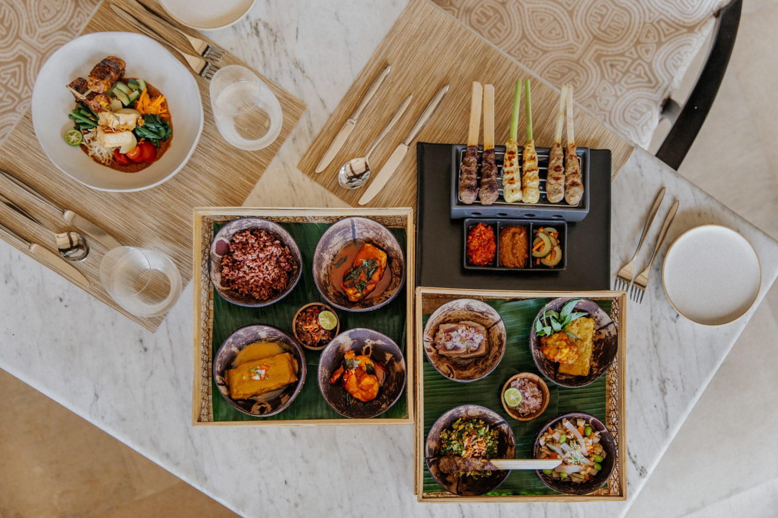 While Ubud has no shortage of destination-worthy dining options, the resort’s restaurants still stand out. A particular highlight is Sokasi, a cooking school by day and chef’s table by night, where you get to sample typically Balinese dishes such as ayam timbungan chicken cooked in bamboo; a babi guling pig roast, which is spun over a fire for hours; and ikan klengis (barramundi marinated in local spices and coconut pulp). You’re seated so close to the action that you can practically feel the heat of the stove on your face, and you’re welcome—encouraged, even—to ask questions. The chef might even send you home with a small bamboo basket of local red rice and a flyer with step-by-step instructions to re-create the dish in your own kitchen.