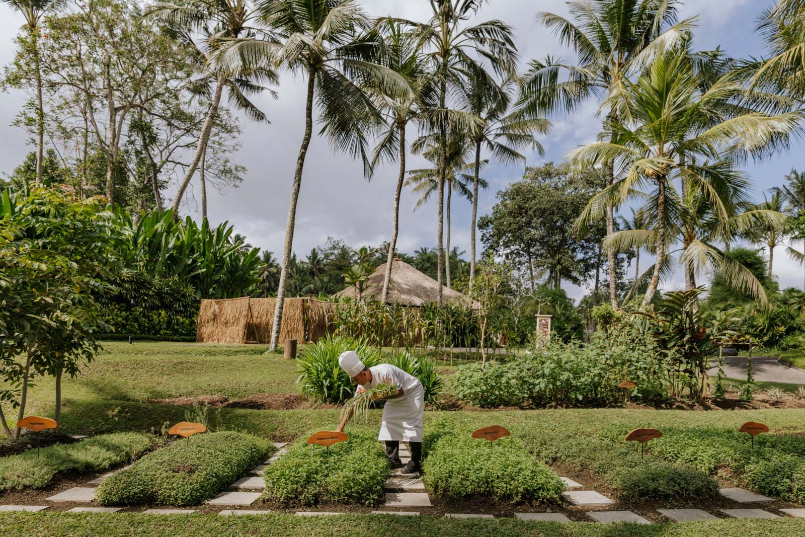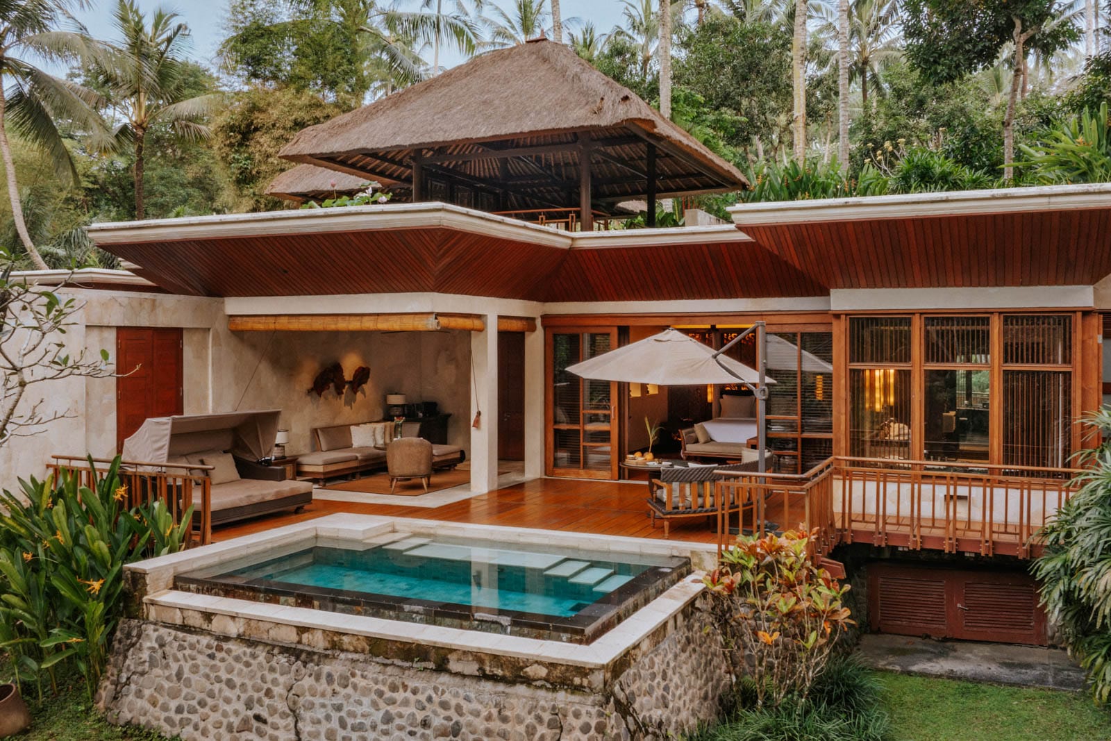 Next, you’ll notice the undulating lawns, where gardeners with straw hats work the rice paddies, and the little streams and waterfalls that flow in between. Then you’ll see the villas, barely visible with their camouflaged roofs made from alang-alang thatch. Their spacious verandas and plunge pools are concealed by tangles of tropical greens, making them perfect for long days of pool-lolling in total privacy.