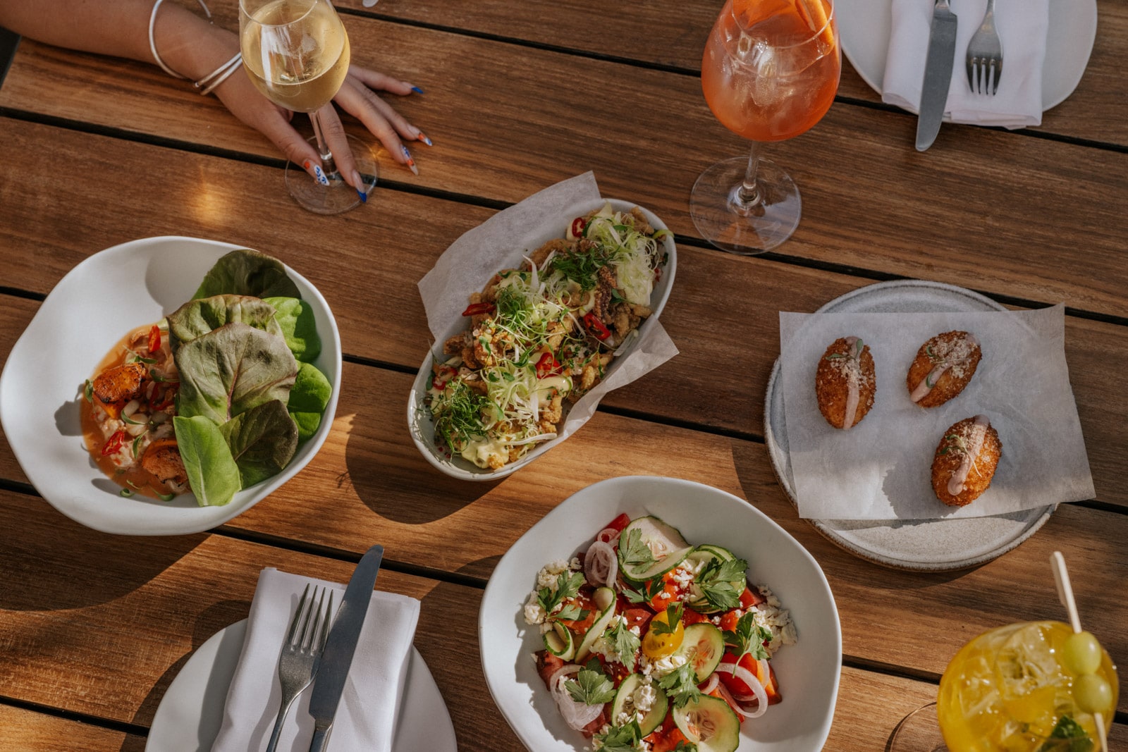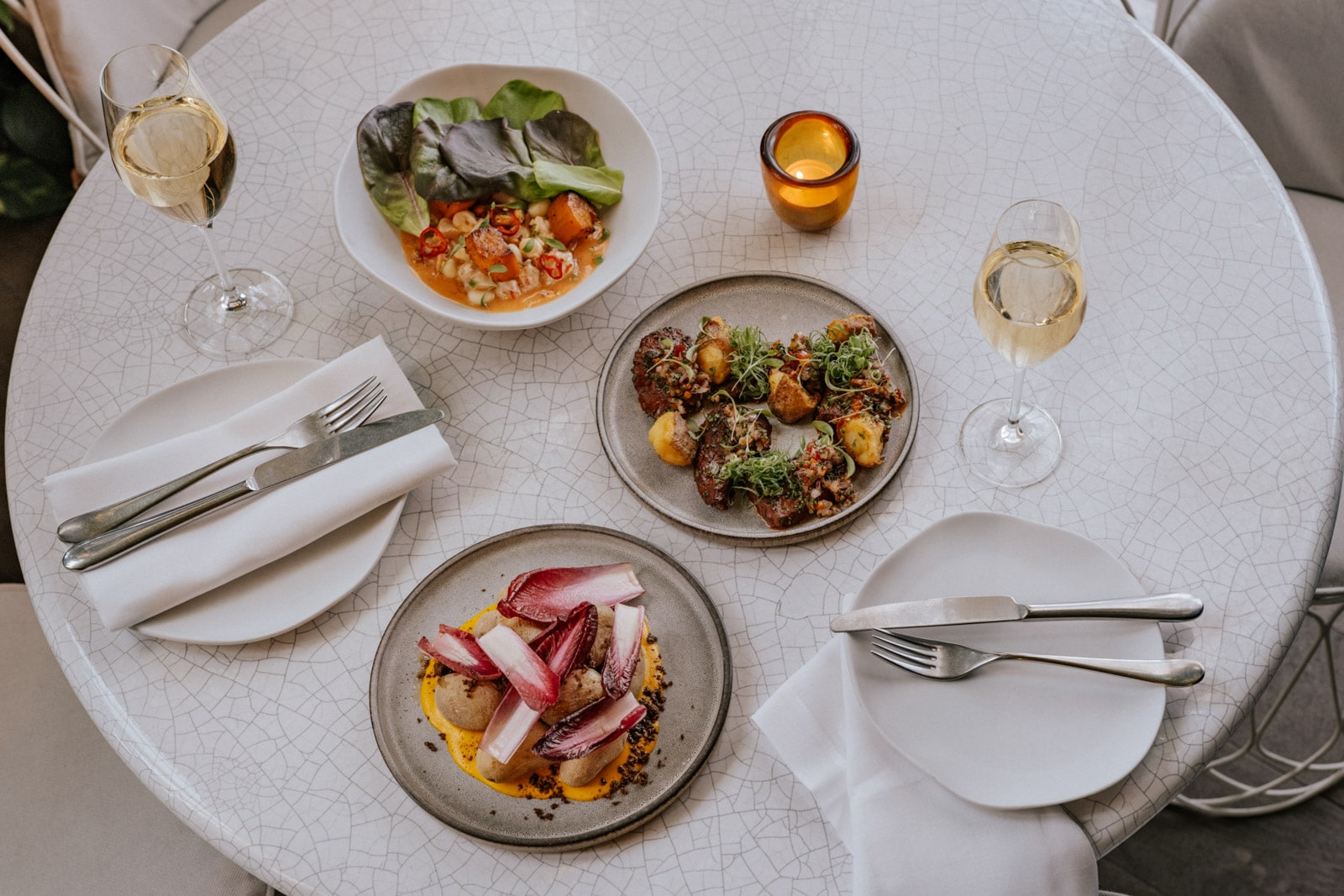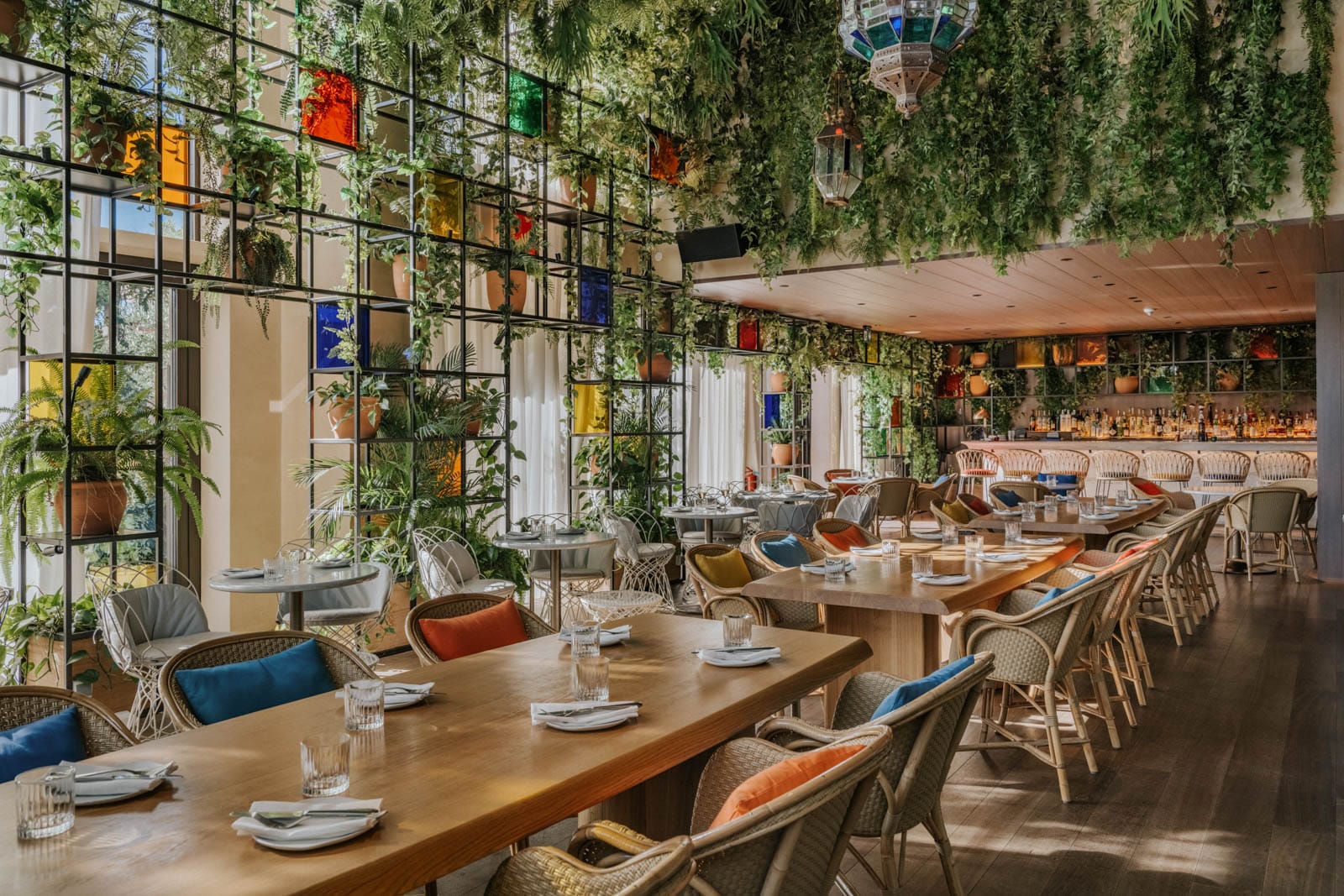 Oroya’s interior is set in a large glass-walled cube, which morphs from an airy, sunny daytime respite to a vibey after-dark haunt with a backdrop of city lights.
