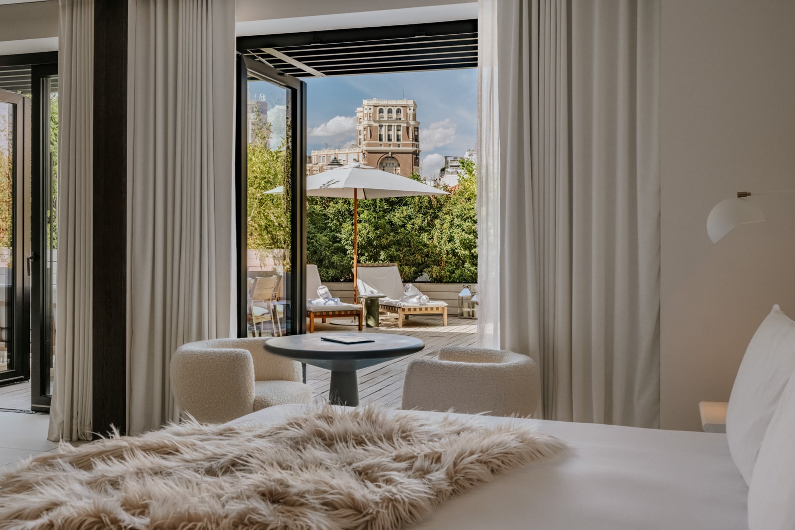 Rooms at The Madrid EDITION are sleek and airy, with an all-white, minimal aesthetic that feels soothing and understated, yet not too spare. A mix of textures—a bouclé accent chair, a soft faux-fur throw and deep brown-black wood closets—lends depth and warmth to the space. For the ultimate indulgence, the two penthouse suites (the Madrid Penthouse Suite and the Opera Penthouse Suite) both come with expansive terraces, kitchenettes and private pools. But soaring ceilings and carefully placed lighting create a Zen-like mood in even the more modest Superior and Studio Terrace rooms.