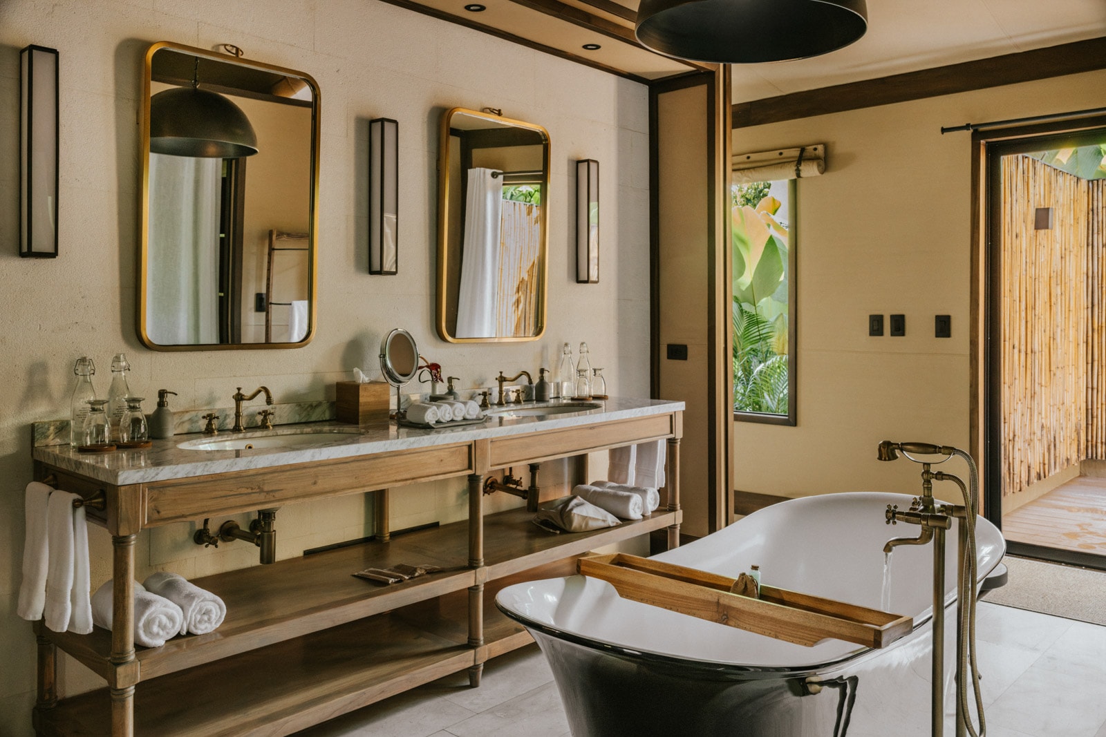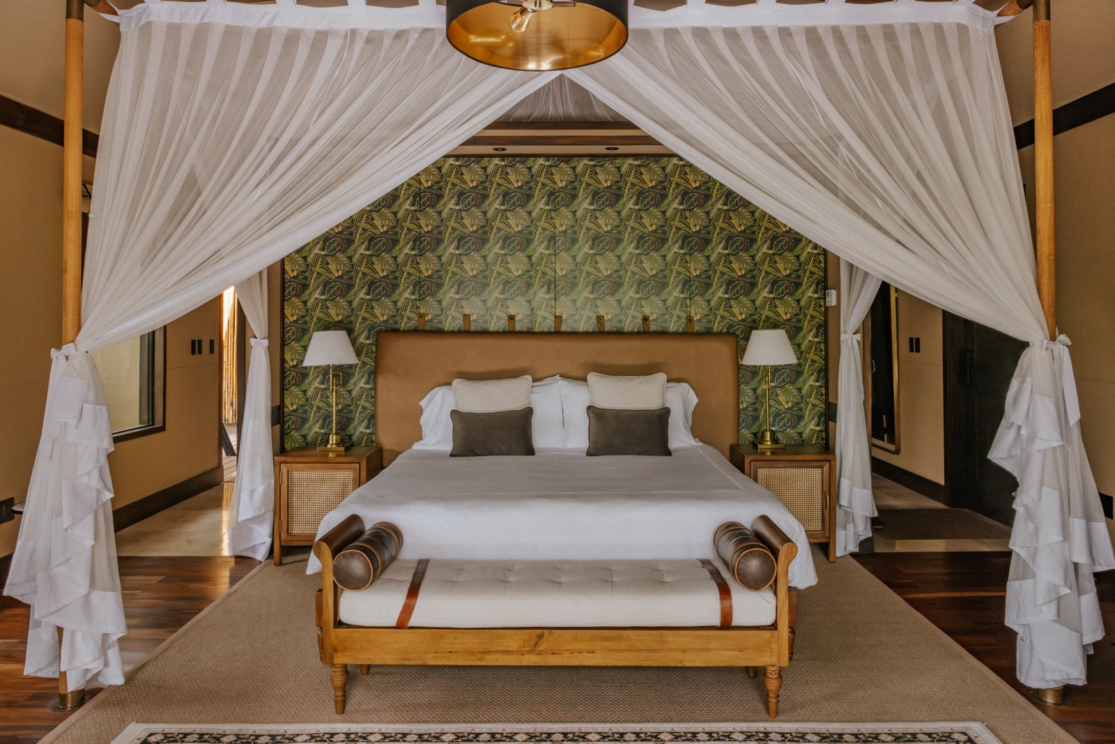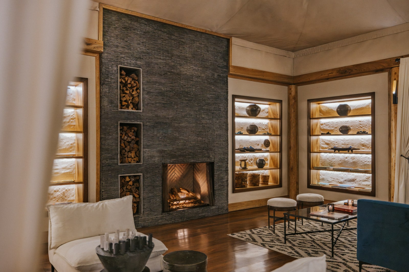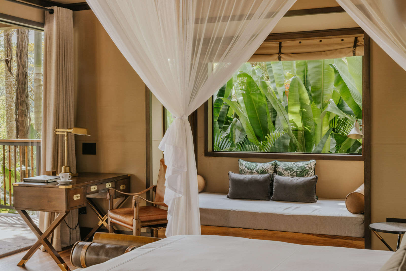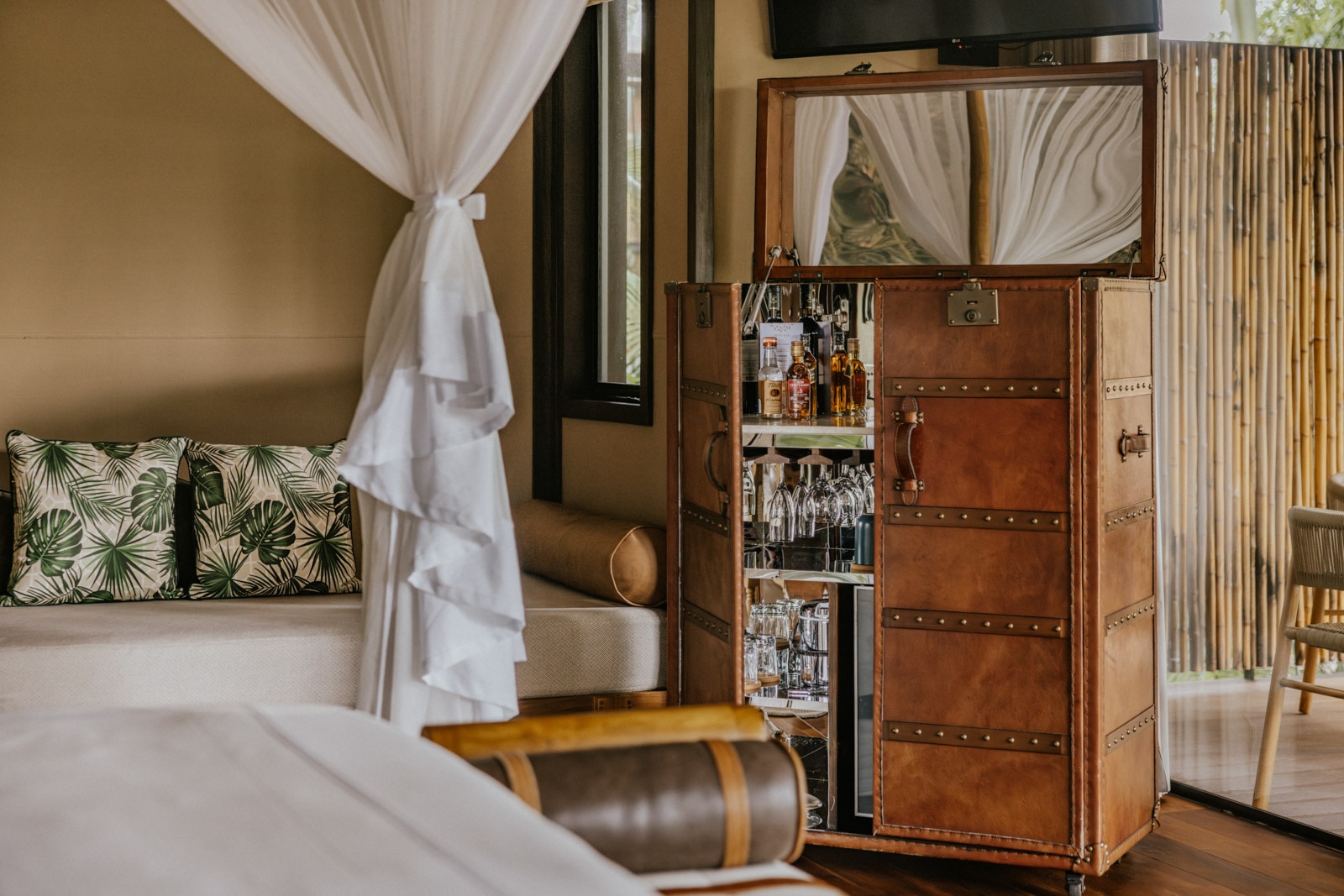 No matter the room type, swooping sail-like canvas roofs, nylon-clad exterior walls and interior walls covered in cotton canvas instantly telegraph an old-school safari vibe. That aesthetic is bolstered by dark wood furniture, windows dressed with roll-up canvas blinds and a massive trunk-style leather minibar, its mirrored doors purposely left open when you arrive, to dramatic effect. Bathrooms feature both indoor and outdoor showers, a walk-in closet and a stand-alone tub, placed in the middle of the space under a glowing pendant lamp. And a spacious private deck comes equipped with a dining table, hammock, double chaise and jetted infinity plunge pool, fed by the warm waters of the resort’s private mineral springs.