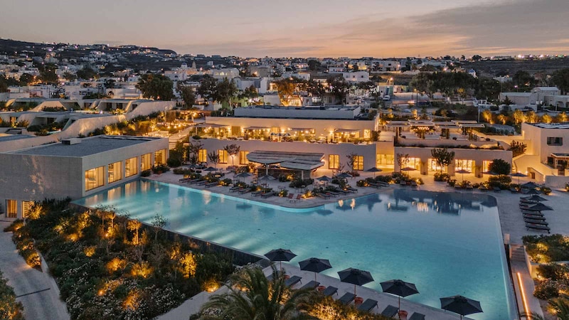 Alternating walls of white concrete breeze-blocks and warm hardwood turn the rest of the resort into an immersive installation of light and shadow, and the flecks of ivory, beige, black and brick red in the omnipresent terrazzo echo the colors of Santorini’s various beaches—which you may or may not choose to visit. The resort’s central location just outside the capital of Fira puts them all within driving range, but on Santorini, parking is brutal, and cabs are expensive. You have our permission to remain at the pool, which is so large it almost feels like the Aegean.