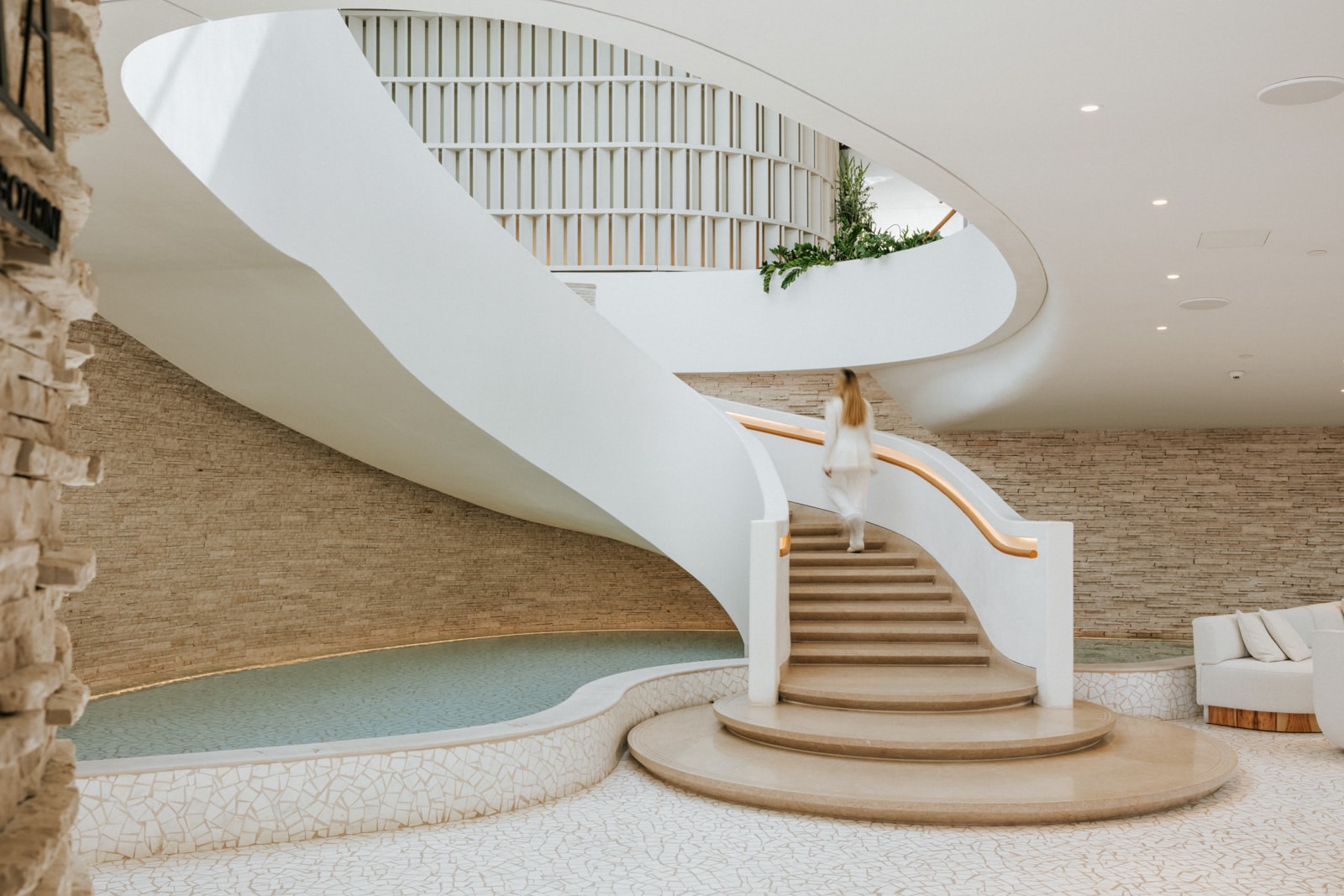 The hotel’s rooms are just as grand as the rest of the property. Though they’re outfitted in neutrals (think: pale, softly rounded wooden furniture and cream-colored linen curtains), the decor is hardly simple. Floor-to-ceiling glass brings in natural light and Riviera or garden views, and stone walls run up against mirrored panels that line the top of the room, making the space feel infinite. You’ll also find earthy textures like marble accents, curved rattan light fixtures and timber furniture. Bathrooms follow suit, many with rainfall showerheads, freestanding tubs, heated floors and heavy bronze finishings.