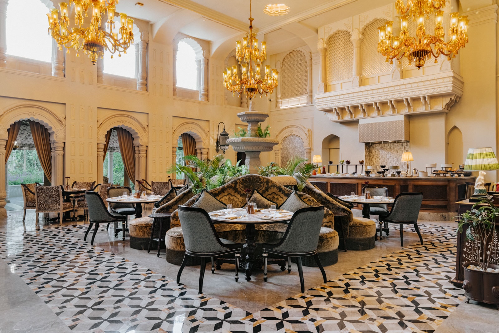 Raffles Jaipur has two restaurants and two bars on-site. For regional Rajasthani food, head to Arkaa, where you’ll have your pick of classics like Delhi chicken, garlic naan and tandoori lobster masala served on gold embossed plates. Arkaa, which means “the sun” in Sanskrit, features a warm yellow dining room filled with amber-colored chandeliers, inlaid marble floors, paisley- and cheetah-patterned seating, and intricate latticework on the walls.