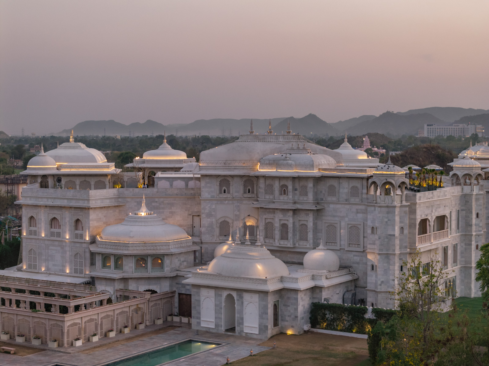 The all-white façade of Raffles Jaipur is modeled after a zenana, or the women’s quarters of a palace.
