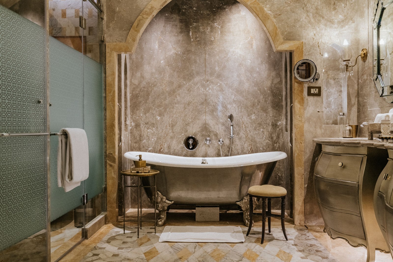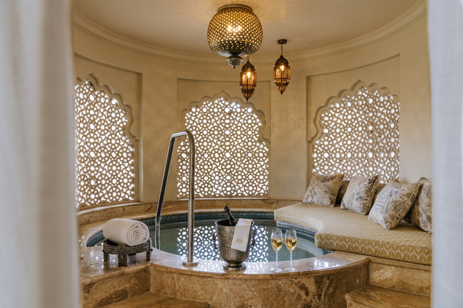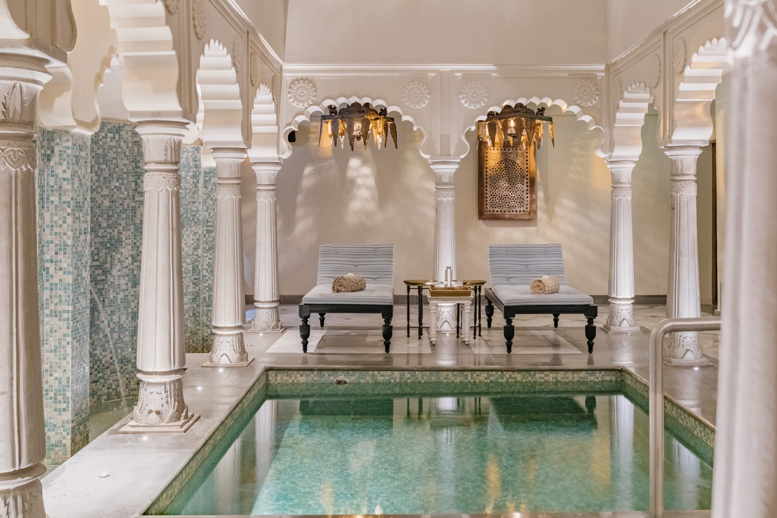 As such, the property is reminiscent of a private estate—albeit one with an underground spa and 50 guest rooms. No two are the same, but they all feature details like hand-carved furniture and hand-painted wall decals. It’s a spectacle of design, with Mughal-style archways, hand-woven carpets, intricate thikri (traditional mirrored mosaics) and custom marble-inlay flooring.
