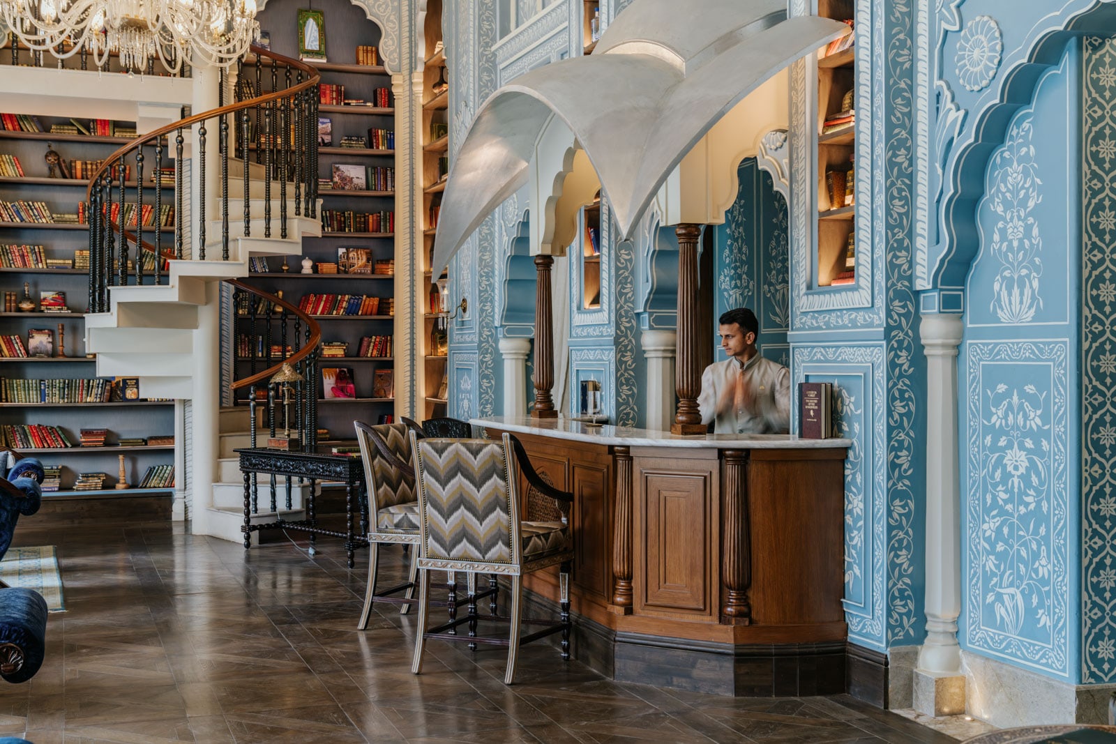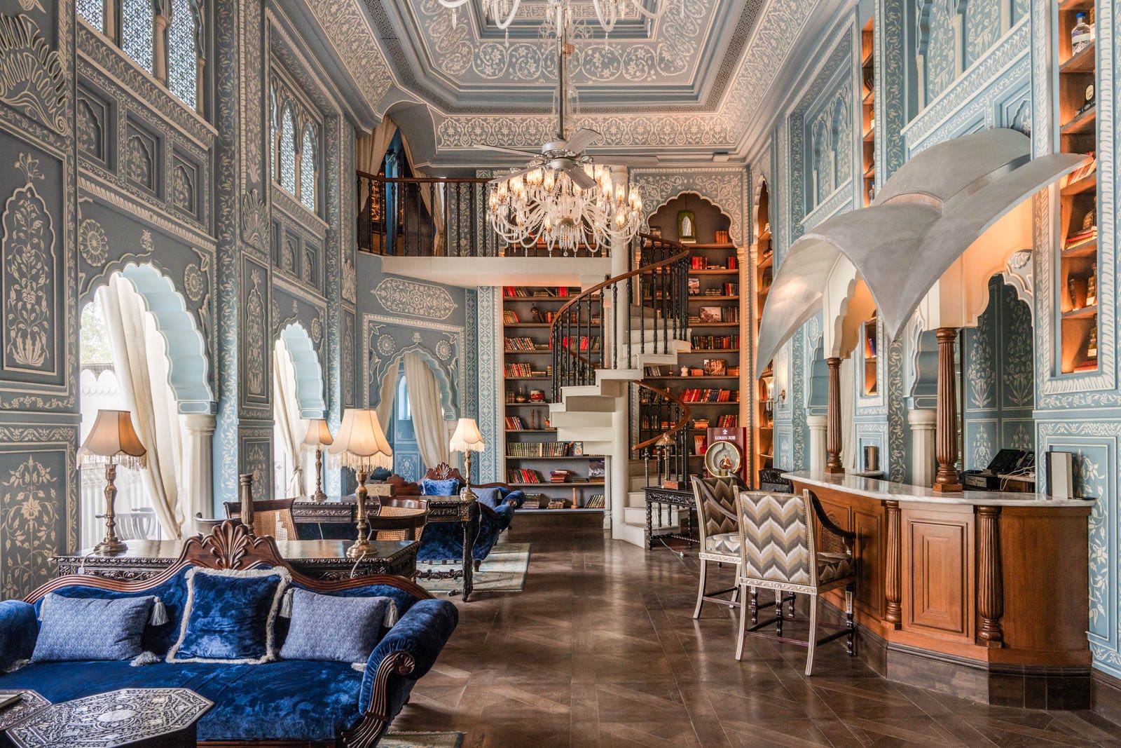 The sky-blue Writers Bar at Raffles Jaipur features hand-painted decals, a grand spiral staircase and over 2,000 books on the shelves. (Angela Sun/Chase)
