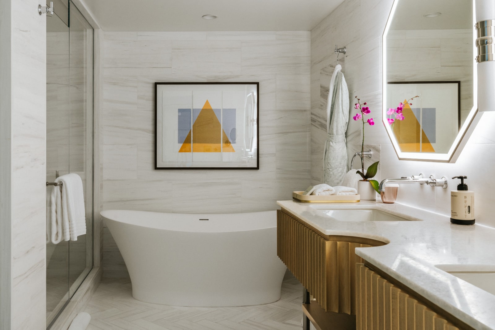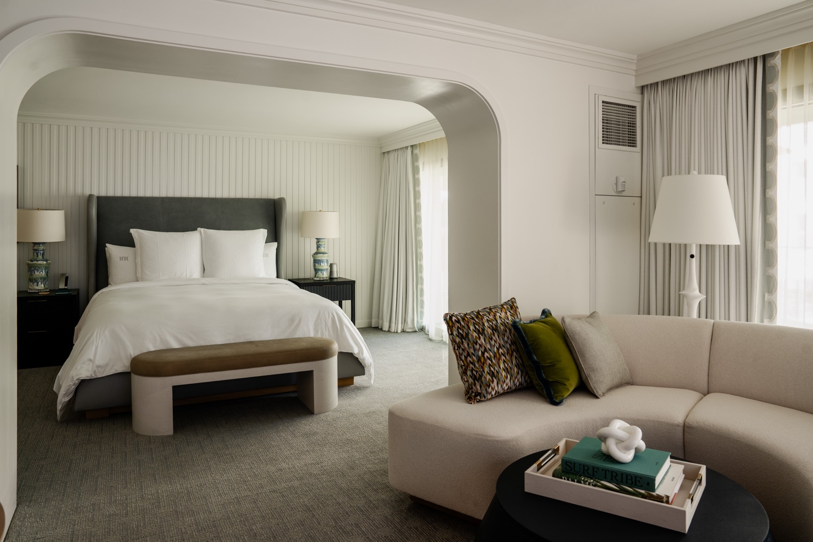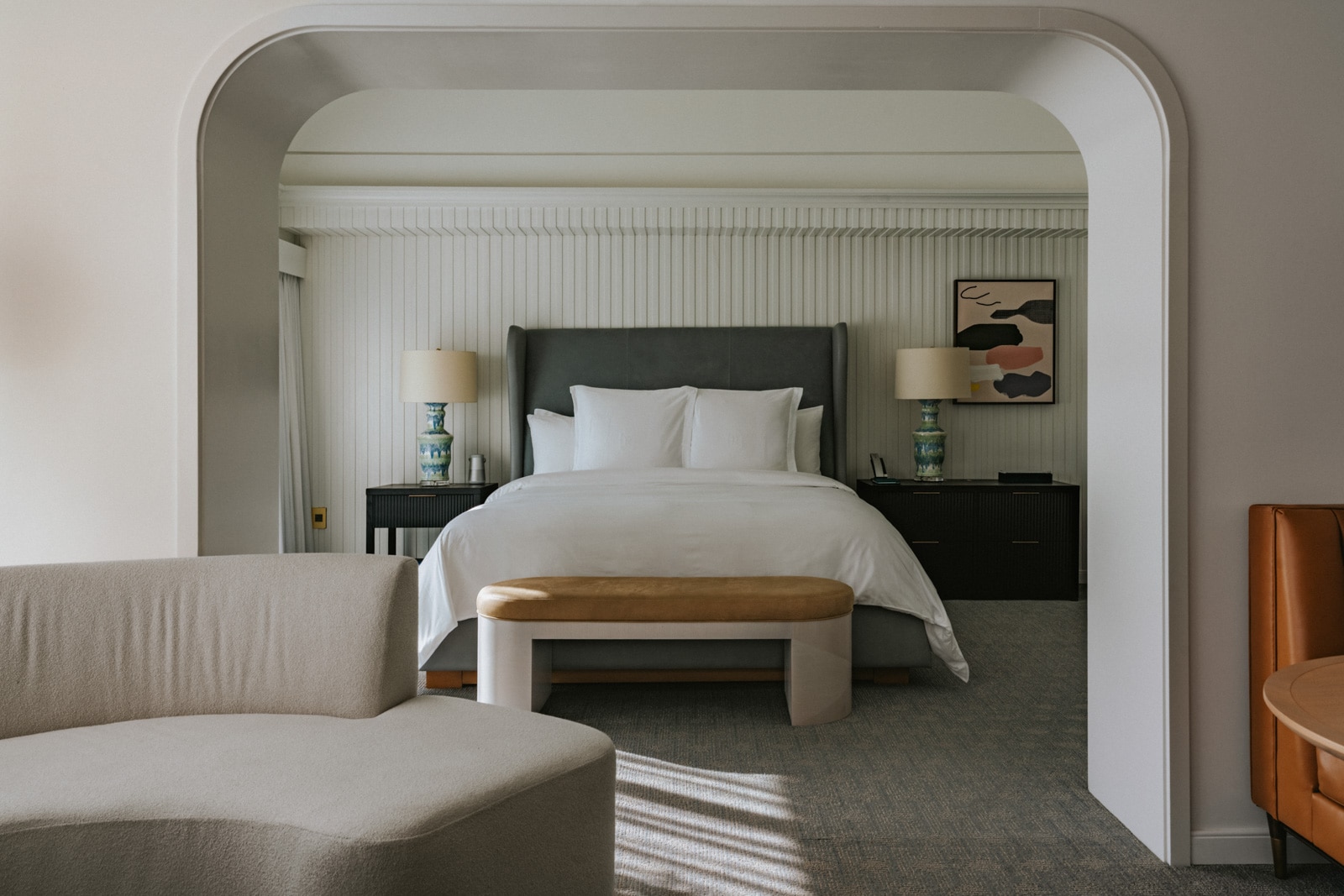Wedged between the hotel’s two wings, there’s a large pool overlooking the ocean where you can spend your afternoons—unless you’d prefer to have a beach butler set you up across the street, complete with a direct contact number and snacks and drinks at your discretion. Elsewhere, there’s an all-day grab-and-go bakery and café by Ayesha Curry, the multi-hyphenate entrepreneur and wife of one basketball player whose name isn’t spoken around these parts. Get yourself a black truffle Caesar salad and some baby heirloom beets with hazelnuts in between activities (or, if you’re here to attend a conference in one of the hotel’s many meeting spaces, between panels). Even the rooms are conceived to feel ultra-welcoming to every guest, regardless of room category, each with a princely floor plan and at least a sliding glass door or balcony.