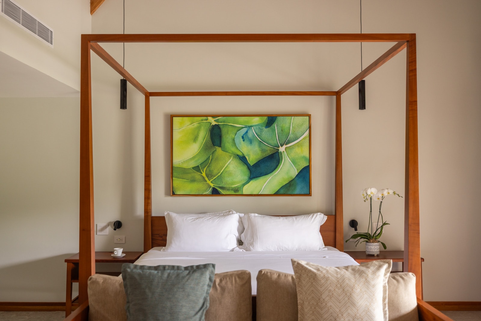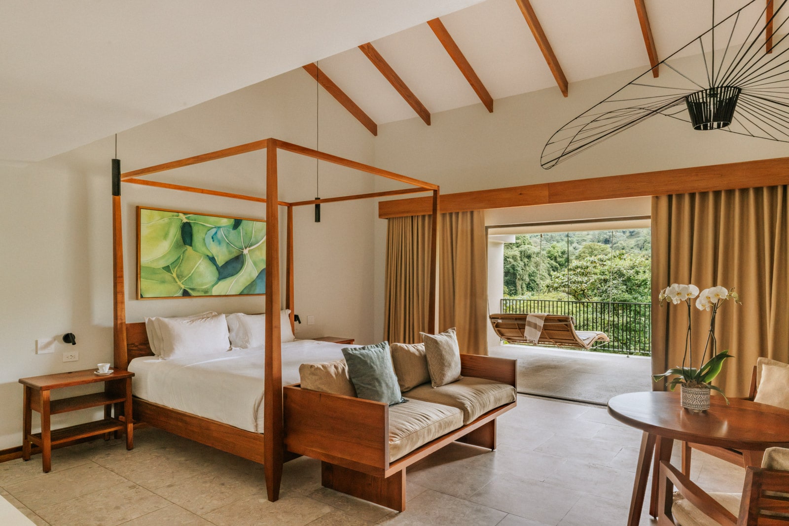 There are 105 rooms in six categories (from entry-level Orchid Rooms up to the premium Two Bedroom Arenal Suite), each with jungle, garden or volcano views. They’re uniformly sleek and modern, with tile floors, bold botanical-themed art and furniture made of local hardwood so distinctly fragrant you smell it the moment you walk through the door.