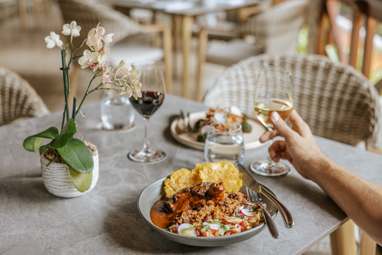 On the hotel side, Tucanes Restaurant is an all-day, open-air poolside spot with a thatched roof and volcano views that serves a buffet breakfast in the mornings. At dinnertime, candlelit tables make the terra-cotta–tiled space feel more intimate (yet still informal), with both an à la carte menu (go for the Caribbean chowder) and two different seven-course tasting menus offering authentic local flavor. Over at the thermal pools, Ave Restaurant serves casual Costa Rican fare, including a delicious Caribbean-style chicken breast with rice and beans.