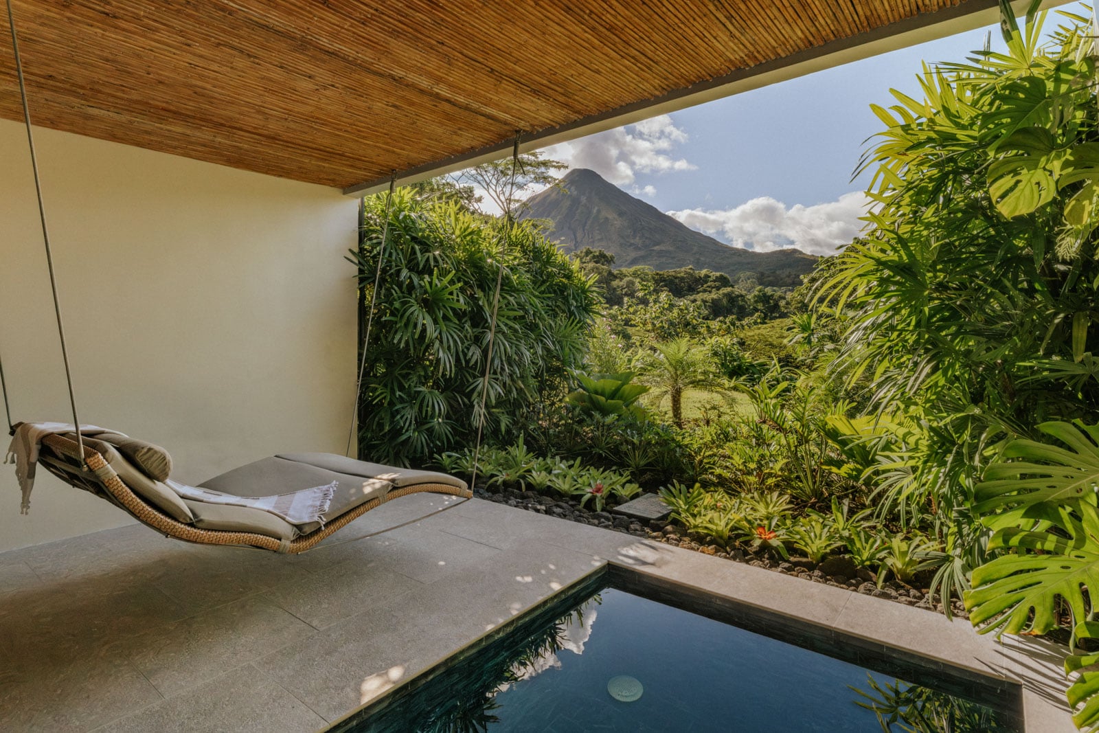 It’s rare that a vacation is actually enhanced by rain, but here we are—“here” being Tabacón Thermal Resort & Spa, nestled in 900 acres of protected rainforest near Arenal Volcano National Park. The rain, which occurs almost daily, creates a soothing patter as it falls on forest foliage so thick it obscures the ground below, and it’s best experienced while swaying lazily in the hanging lounge bed suspended above your balcony. Between the earthy scent and the verdant views, it’s like a spa soundtrack come to life, inspiring an immediate desire to pause and “be here now.”