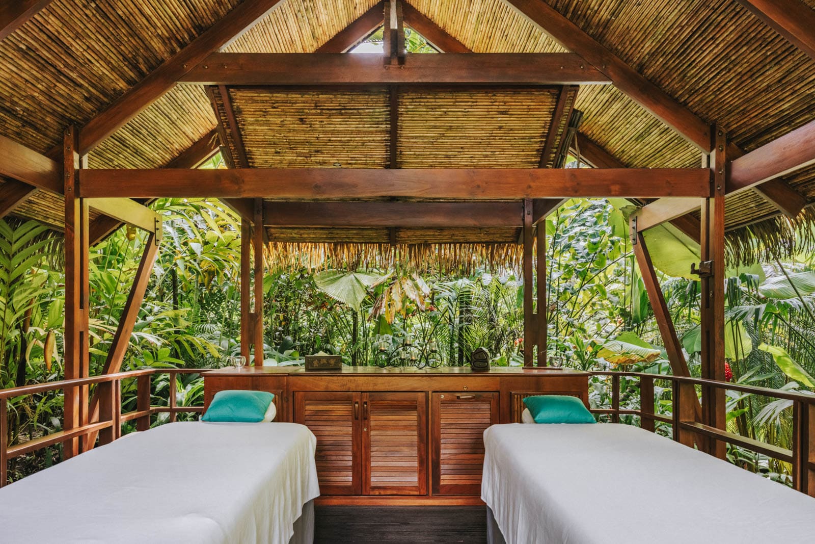 Much of the time, they’re at the jungle spa, set amid thriving palms and a colorful riot of heliconia. Arrive at least 30 minutes before your treatment to soak in the hot tub, then make your way to an open-air bungalow (there are only nine, so pre-arrival reservations are recommended) for a muscle-melting rubdown. You can’t go wrong with the pineapple body scrub paired with a deep-tissue massage, performed to that aforementioned soundtrack of steady rain and tropical birdsong.
