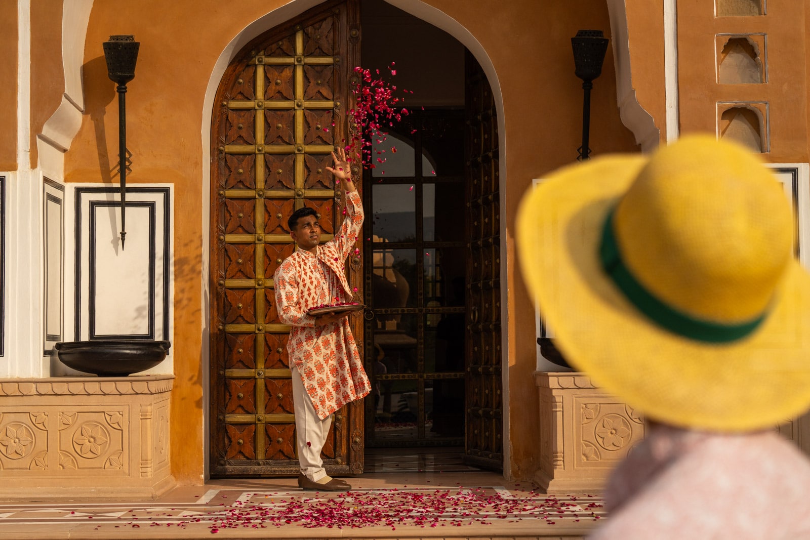 After strolling through the grand, fountain-lined entrance, you’ll be treated to an extravagant welcome ritual: You’ll be showered with rose petals, then given a necklace of bright yellow marigolds and a tika (welcome blessing) for health, wellness and prosperity.