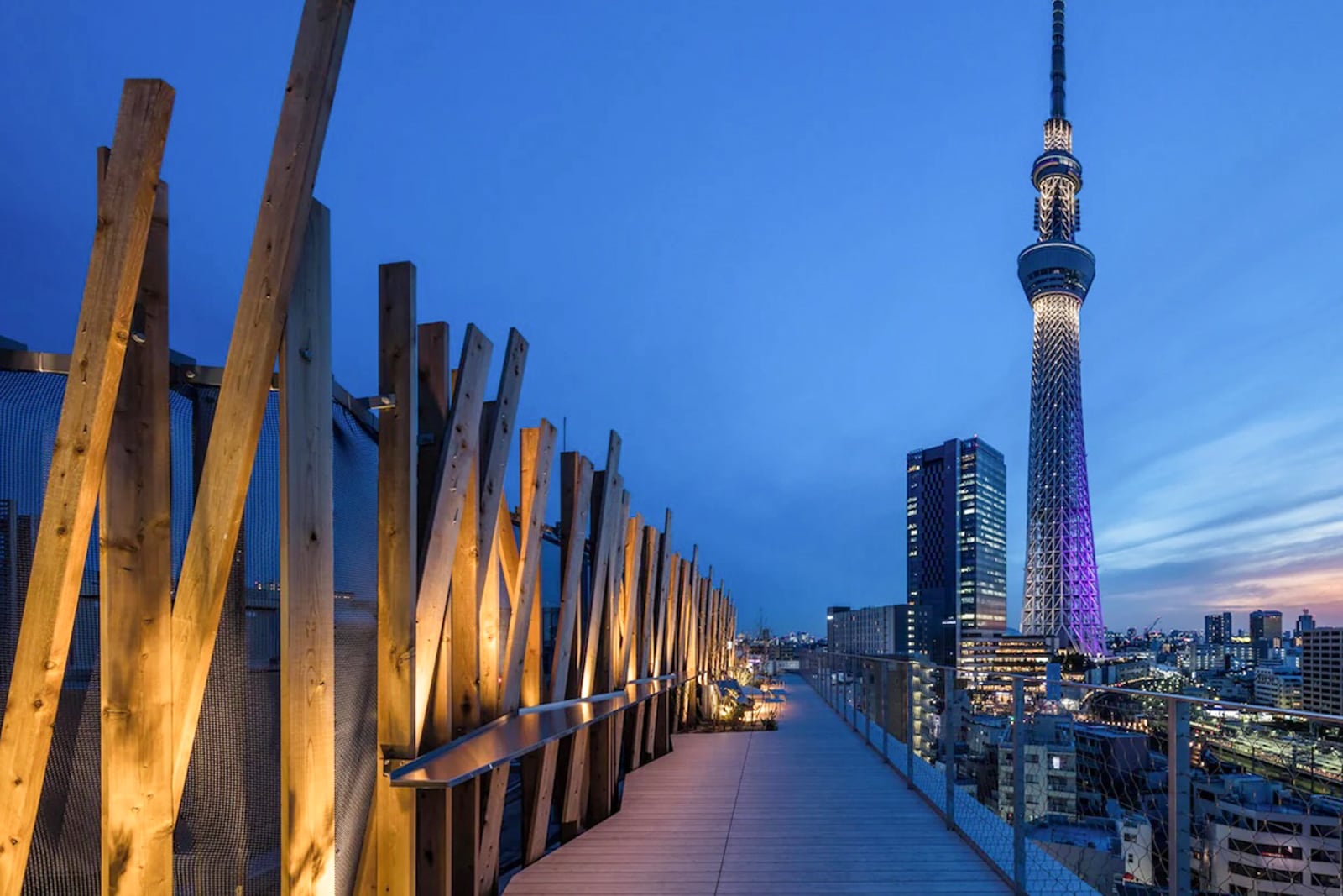 This design-centric hotel from legendary Japanese architect Kengo Kuma makes a lasting impression even before you enter. Outside, you’re greeted by an imposing concrete façade artistically strewn with wooden planks. That concept carries into the small yet stylish rooms, where concrete floors, unfinished wooden walls, metal sinks and glass-walled showers create a decidedly industrial vibe. Each one even comes with a data-enabled smartphone you’re welcome to use during your stay. Be sure to check out the rooftop terrace, where Kuma’s dramatic wooden plank concept frames an unforgettable view (and great photo op) of the Tokyo Skytree.