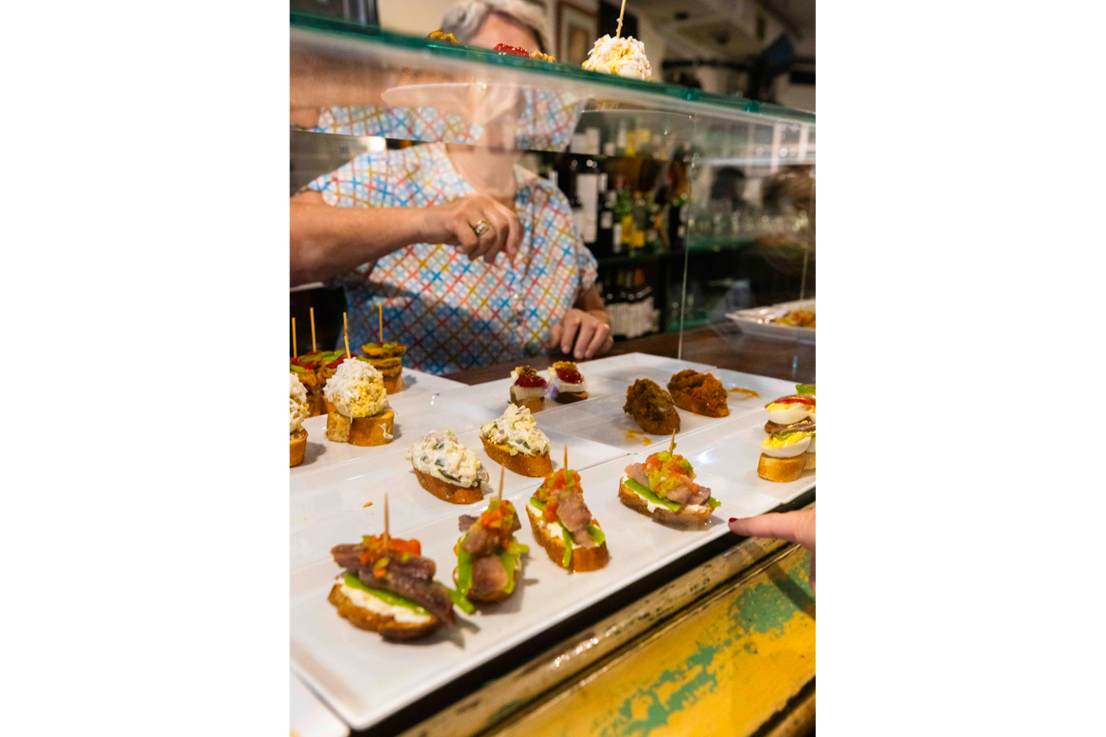 Bar TxepetxaOpens overlay is an anchovy shrine. Two fish-shaped display boards list the offerings—one for marinated anchovy pintxos, another for hot ones. Go for the jardinera (a sharp salsa with onions and red and green peppers, including guindillas) and the arándanos (anchovies paired with blueberries). Eat them, then order another round before you can think twice.